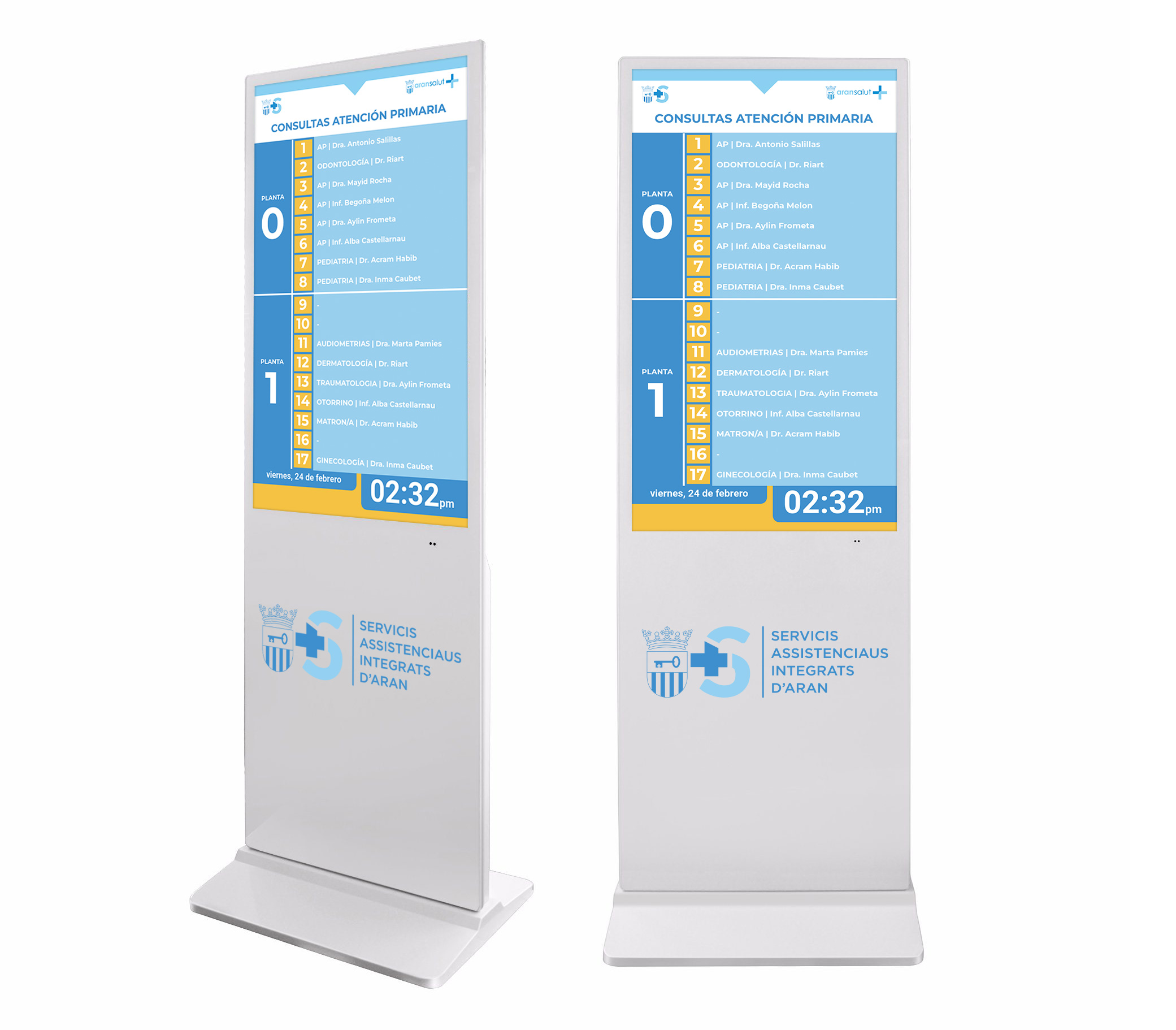 KAY PRODUCCIONS ha instalado dos directorios multimedia modelo BASIC STAND 55” en la nueva planta de atención al usuario del Hospital de Viella, este soporte facilitará al usuario identificar consultas, zonas de pruebas y zona de hospitalización .